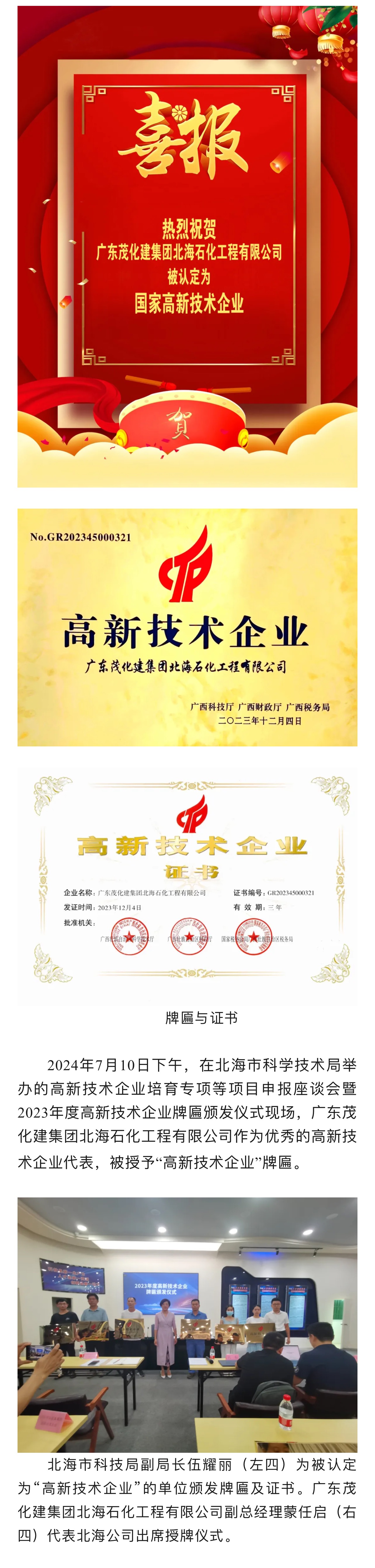 喜報|廣東茂化建集團北海石化工程有限公司 躋身“國家高新技術(shù)企業(yè)”行列