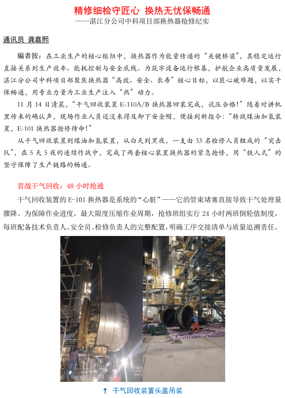 湛江分公司中科項(xiàng)目部換熱器搶修紀(jì)實(shí)