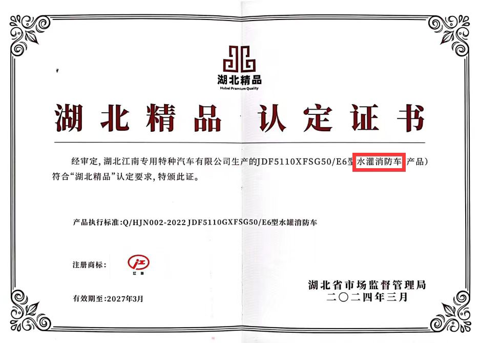 江南JDF5110GXFSG50/E6型水罐消防車獲得“湖北精品”榮譽(yù)稱號
