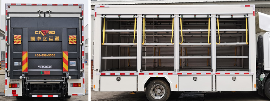 JDF5100XZBQ6型裝備車由底盤、液壓搭橋(尾)板、器材箱等組成,內(nèi)部設(shè)置隔間,可根據(jù)運(yùn)輸設(shè)備的外形尺寸及特點(diǎn)固定、安裝,用于后勤保障,向一線輸送特種裝備。該車系選用慶鈴汽車股份有限公司生產(chǎn)的QL1110ANKAY二類汽車底盤改裝而成,原裝單排駕駛室,可載含駕駛員在內(nèi)的乘員3人,駕乘舒適輕便。該車用于消防救援隊(duì)裝備運(yùn)輸,兩側(cè)卷簾門,車尾安裝搭橋板或1噸垂直升降液壓尾板,搭橋板主要用于機(jī)器人上下車廂;貨物可通過液壓圍板上下車,內(nèi)部根據(jù)轉(zhuǎn)運(yùn)器材的結(jié)構(gòu)進(jìn)行鋁合金器材架的搭建,該車最大的特點(diǎn)是操控性好、維修簡便,可廣泛應(yīng)用于應(yīng)急消防隊(duì)、公安、醫(yī)療衛(wèi)生、廠礦企業(yè)及社區(qū)、碼頭等場所。